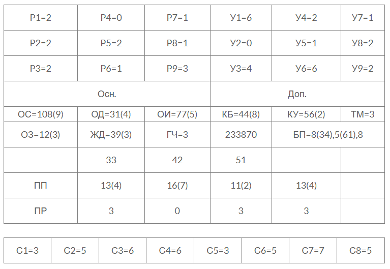 ОС (дело жизни) определяется как сумма всех числовых значений букв полного ФИО, приведенная к однозначному числу. Возвращаемся к таблице: