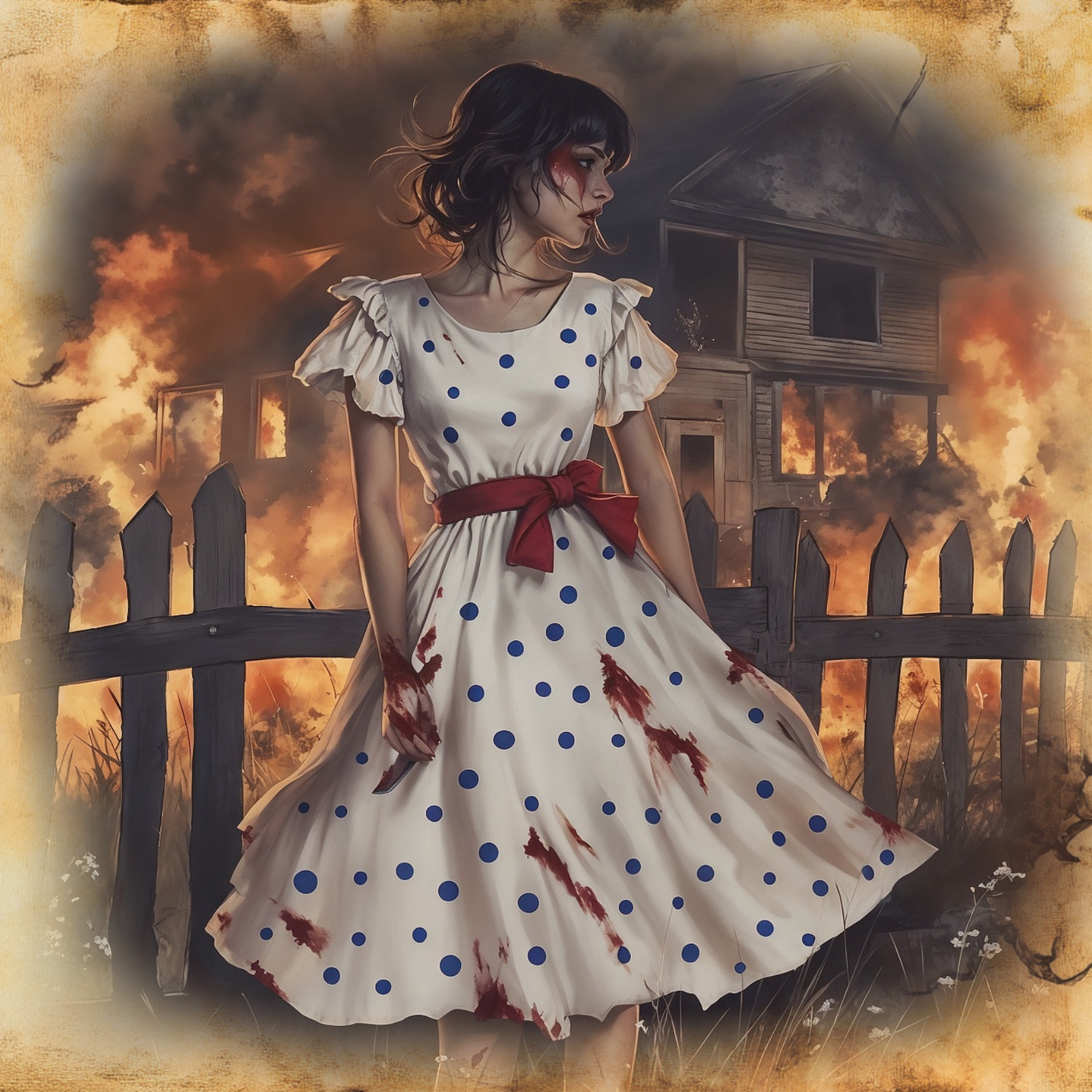 На щеках грязные дорожки от смешанного со слезами пепла, запачканное кровью платье – пышное, белое, в синий горох. На поясе красная лента с кокетливым бантом, на ногах туфли – тоже красные.