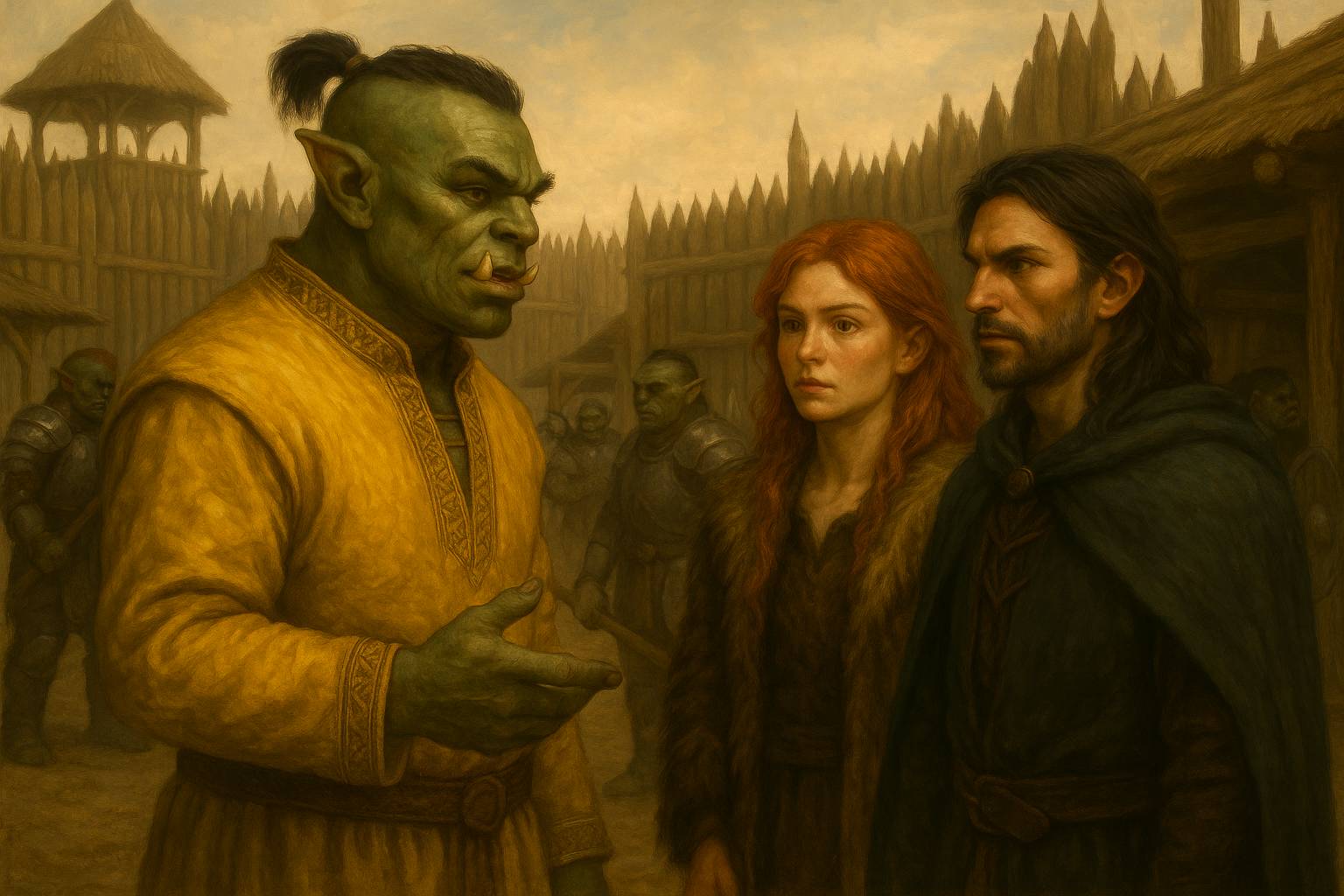 Спустя какое-то время процессия добралась до укреплённого лагеря. Валдринги ощутили на себе внимательные взгляды орков, их настороженность и даже лёгкое презрение, явно читающееся в суровых выражениях лиц. Лагерь был укреплён мощными деревянными стенами, а внутри угадывались тренировочные площадки, оружейные склады и конюшни. Орки, казалось, действовали слаженно и организованно, разрушая стереотипы о хаотичной природе их народа. Волк заметил, как у ворот мелькнуло несколько фигур в богато украшенных доспехах, намекая на высокую дисциплину и статус этого места. Центральное здание, обнесённое частоколом и охраняемое вооружёнными стражниками, выглядело довольно внушительно. Волк заметил, как из дверей вышел орк в жёлтой, явно дорогой, одежде. Этот орк, по-видимому, занимал высокую должность. Подойдя к валдрингам, он задал вопрос на языке центральных королевств: