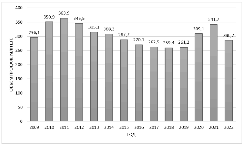 Рис. 1. Динамика продаж ПК в мировом масштабе с 2009 по 2022 г., млн шт. Источник: [Компьютеры (мировой рынок), 2023].