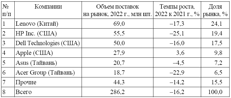 Сам мировой рынок ПК представляет собой олигополию – на продукцию шести компаний в 2022 г. приходилось 85,5 % их розничных продаж. В настоящее время крупнейшим в мире производителем ПК является компания Lenovo (Китай), занимающая более 24 % рынка (табл. 1).