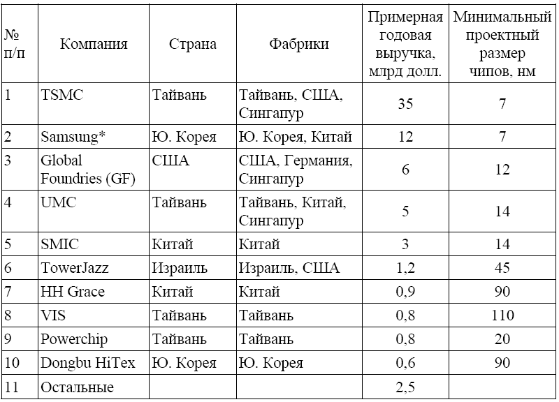 Таблица 2. Крупнейшие контрактные производители[23] микросхем (по состоянию на 2019 г.)**