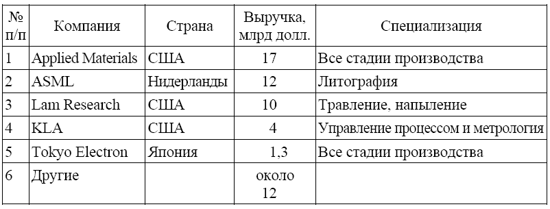 Таблица 3. Основные производители оборудования для микроэлектронной отрасли (по данным на 2019 г.)*