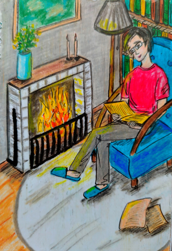 Каждый житель большого дома занимается своим любимым делом. Папа сидит в любимом кресле возле камина и держит в руках четвёртый том исторического романа. Он настолько заинтересован написанным в книге, что даже не замечает, как меняется выражение его лица от нахмуренных бровей до улыбки. И лишь иногда папа приподнимает свои очки на лоб, чтобы помассировать уставшие глаза.
