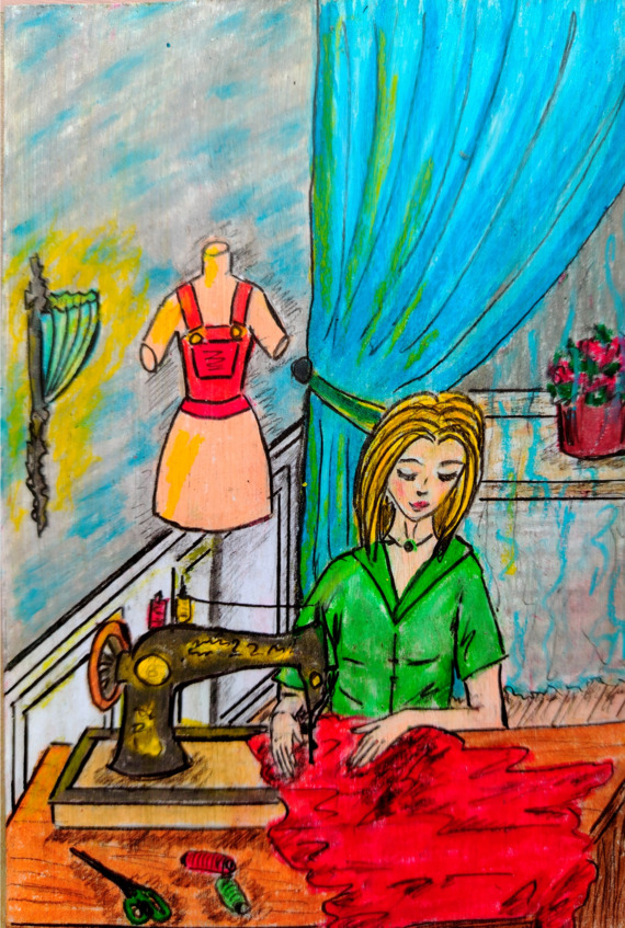 Мама уютно устроилась за швейной машинкой возле стоящего рядом абажура, свет от которого освещает весь стол. Она сосредоточенно строчит ровные и зигзагообразные швы, поворачивая ткань одной рукой, а маховое колесо машинки – другой. И рулон красной ткани в её руках, будто по волшебству, превращается в детский сарафанчик для дочки.