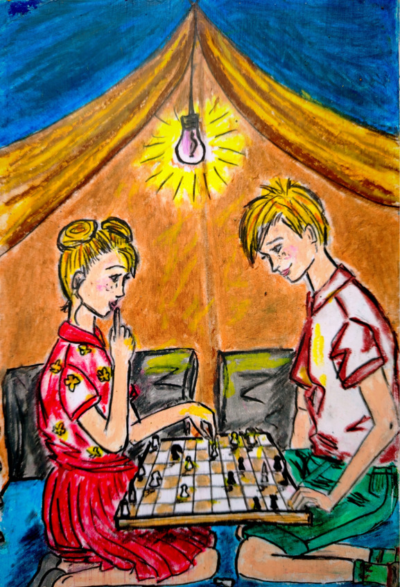 А на втором этаже дома, в детской комнате, брат с сестрой соорудили из большой белой простыни домик – палатку. Они перекинули простынь через верёвку, протянутую от стены к стене. Внутри домика дети повесили гирлянду в виде маленьких звёздочек. И устроившись на мягких подушках, смотрели на светящиеся тёплым жёлтым светом звёзды, представляя, что те настоящие.