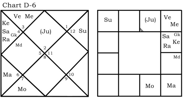 D-6 chart (Shashtamsa) represents a sign divided into six parts. This Varga reveals information about diseases, treatments, periods of illness, and even death.