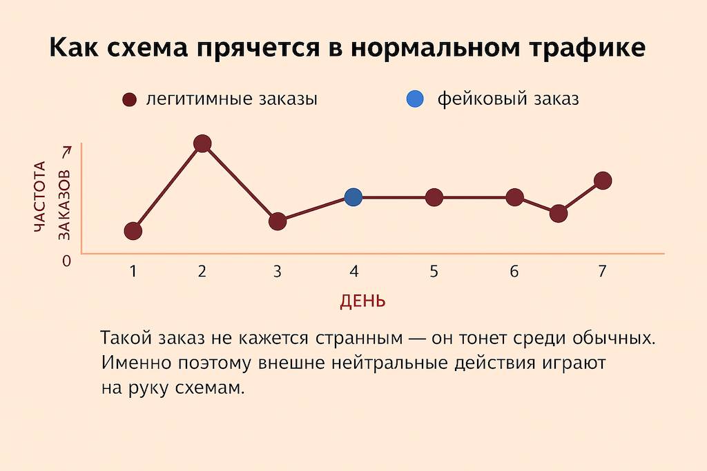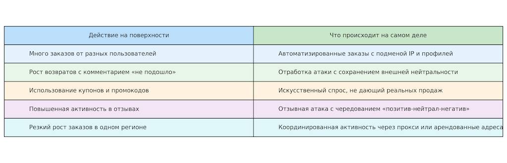 Одна из сложностей в борьбе с нечестной конкуренцией – это то, что многие действия выглядят как нормальная активность: обычные заказы, стандартные возвраты, стандартные скидки. Но за этой «нормальностью» может стоять продуманная схема. Если продавец не распознаёт таких маскировок, он рискует потерять позиции, деньги и контроль над ситуацией.