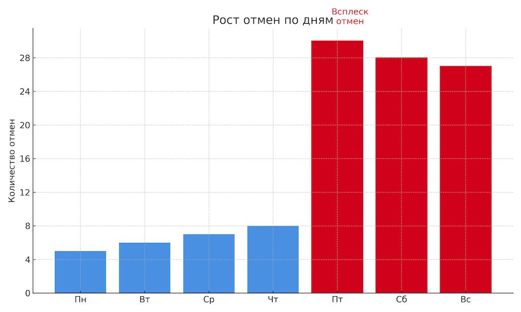 Следующий шаг – визуализация. Сравнение количества отмен за последние 7–10 дней позволяет понять, есть ли аномалия.