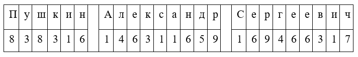 Под каждой буквой в полном ФИО подписываем соответствующее цифровое значение. Для Александра Сергеевича Пушкина, получаем: