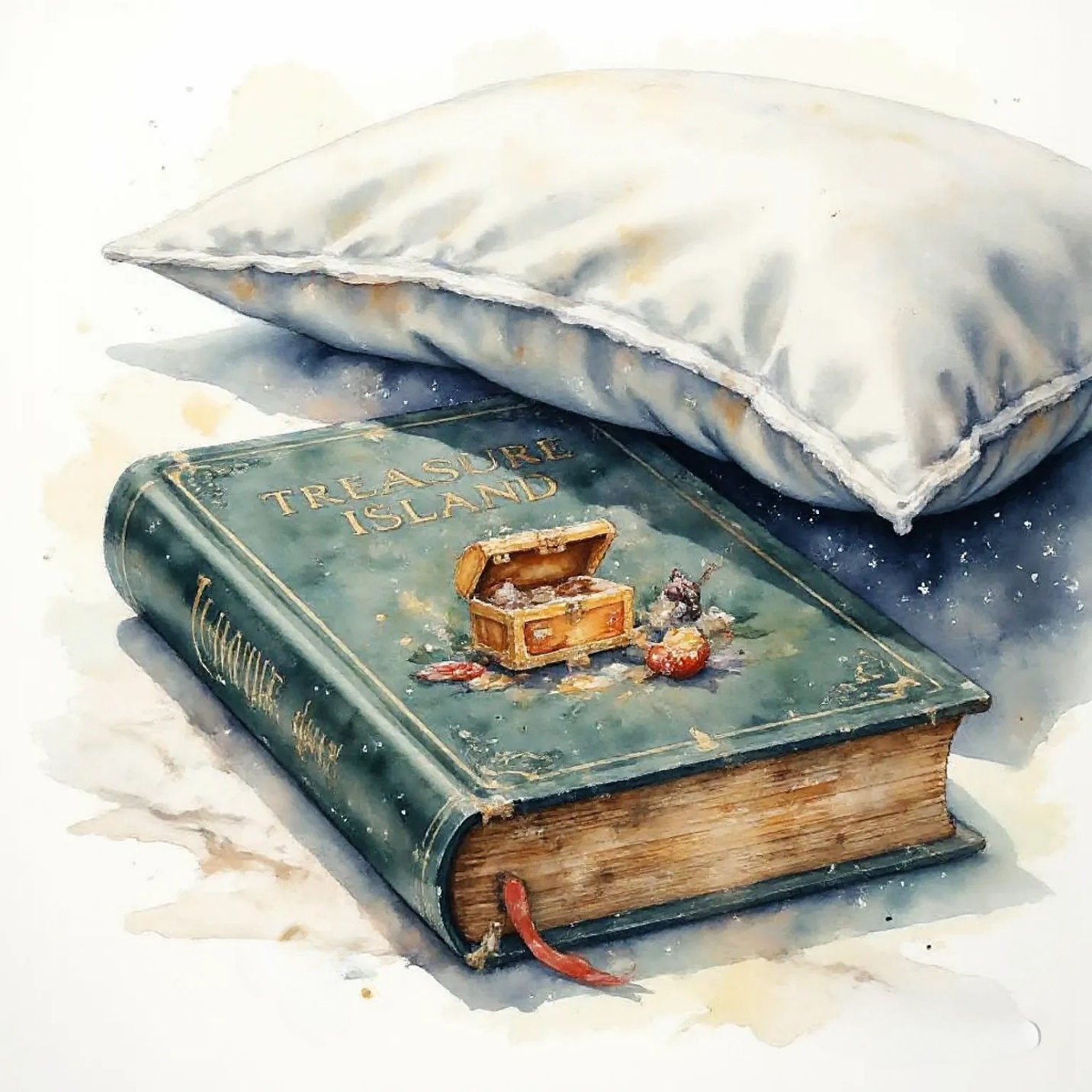 Она поставила планшет на зарядку и отправилась в свою комнату. Взбитая бабушкой перинка была готова погрузить Мию в свои мягкие объятия. Подушка лежала немного, сбившись к стенке, и Мия решила поправить ее. Каково же было ее удивление, когда она обнаружила под подушкой ту самую книгу с зеленым бархатным переплетом, которую ей показывал Шуршундр. Она прочла название: «Остров сокровищ»1 . На обложке с золотым тиснением был изображен приоткрытый сундук с монетами и пират.