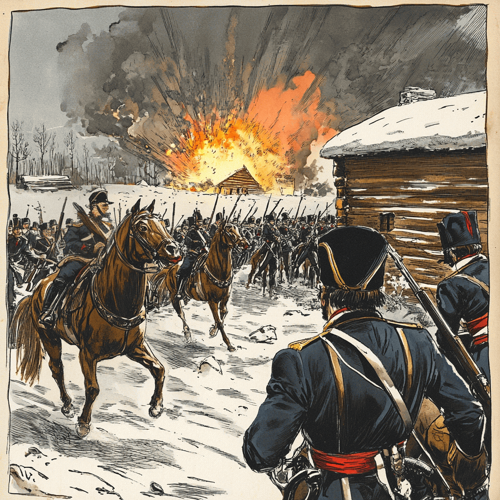 На другой день Наполеон, обогнав армию, в коляске подъехал к Неману и, с тем чтобы осмотреть местность переправы, переоделся в польский мундир и выехал на берег.