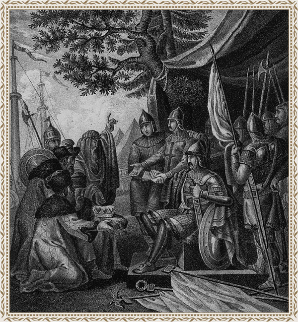 Рюрик, Синеус и Трувор принимают славянских послов, призывающих их на княжение. 862 год