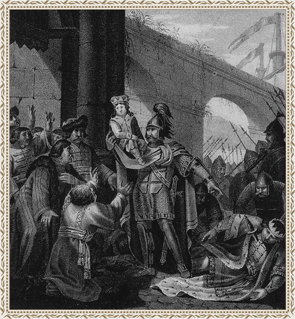 Умертвив Аскольда и Дира, Олег берёт на руки Игоря и, показав народу, говорит: «Вот сын Рюрика, князь ваш». 882 год