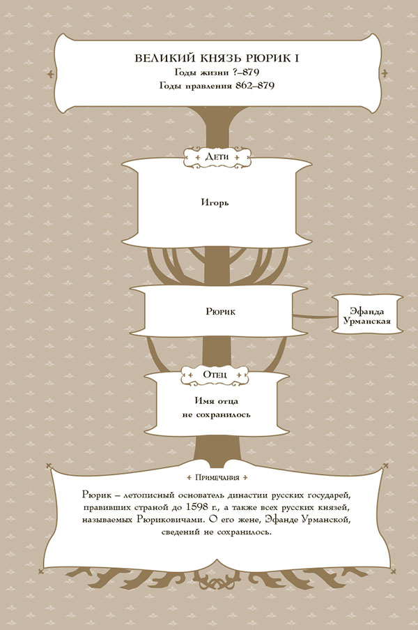 Варяги-русь были рады такой чести, и три брата из князей их – Рюрик, Синеус и Трувор – тотчас поехали к славянам. Рюрик сделался государем в Нове-городе[1], самом старинном из городов славянских, Трувор – в Изборске, Синеус – в земле, лежащей около Белого озера. От этих-то варяго-русских князей славяне начали называться русскими, а земля их Русью или Россией. Синеус и Трувор скоро умерли, и Рюрик сделался один великим князем русским и основателем Русского государства. Он княжил счастливо два года с братьями и пятнадцать лет один.