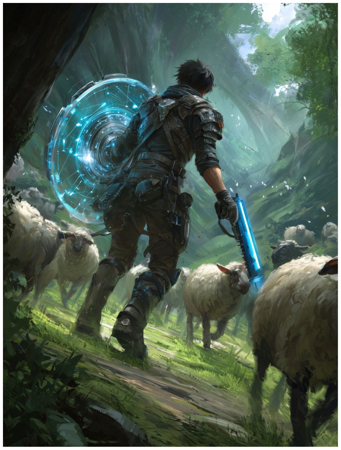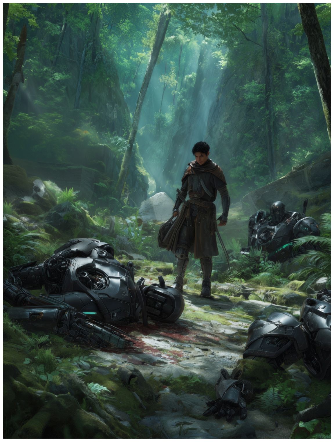 Нам удалось уйти от места боя с десантной группой железодеев от силы на километров четыре-пять, когда в естественном шуме леса что-то изменилось. В то же мгновение я повернулся и прикрылся щитом, но продолжал двигаться спиной вперед. Но, кроме шума чем-то всполошенных животных, ничего не происходило. В моей голове появилась красочная картинка с бегущим за нами десятком элемийских роботов.