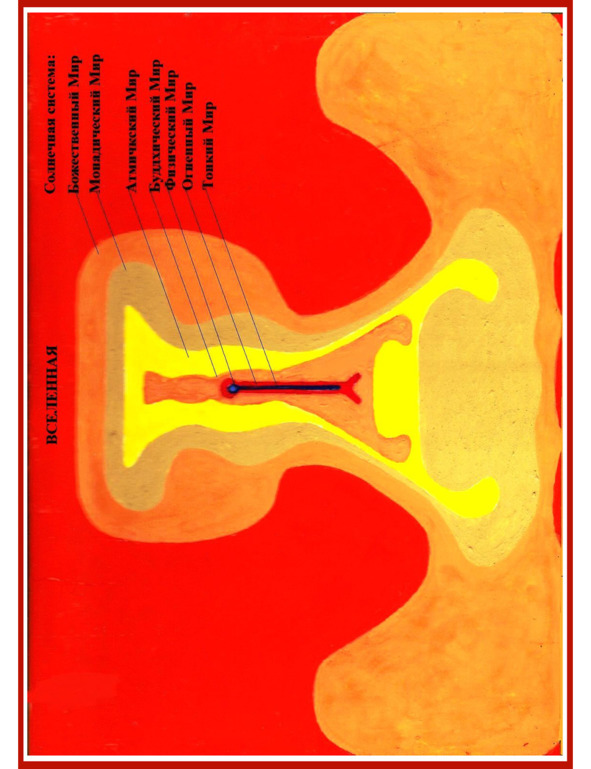 показана совершенно необъятная форма нашей Солнечной системы с её Мирами-сферами. Мы в состоянии видеть только Физический, Плотный Мир нашей системы, который расположен в головной части Тонкого Мира в виде всего лишь миллиметрового кружочка. На изображении 1.
