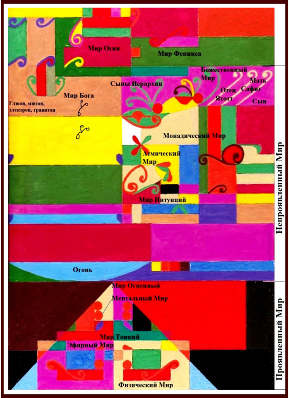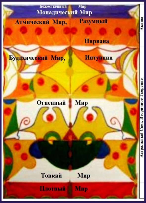 Часто проявленный мир рассматривается как пирамида с вершиной из Огненного Мира, в середине – Тонкий Мир, в основании – Мир Плотный.