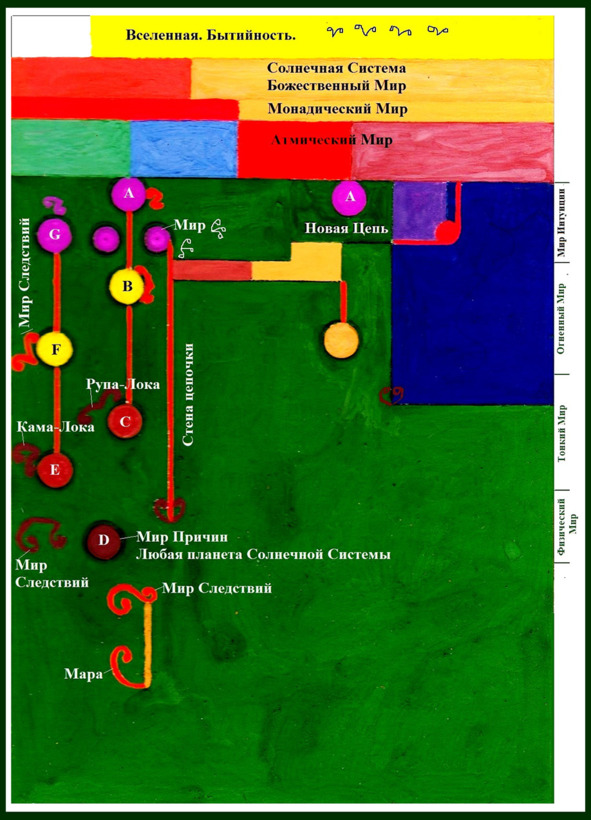 Вначале формируется Первый непроявленный мир, мир Духов. Это четыре сферы: Божественная, Монадическая, Атмическая (Разумная), Буддхическая (Интуиция). Затем создаётся Второй, но уже проявленный мир из трёх сфер (миров), поддающийся человеческому познанию: Огненный, Тонкий и Плотный. 9
