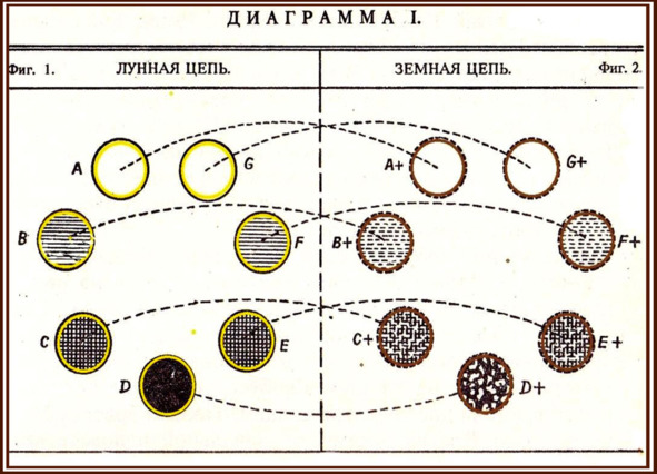 «…В предложенной Диаграмме I. Фиг. 1. представляет Лунную цепь из семи Глобусов в начале её седьмого или последнего Круга; тогда как Фиг. 2. изображает будущую Земную цепь, которая будет, но пока ещё не существует. Семь Глобусов каждой цепи различаются в своём циклическом Порядке буквами от A до G, причём Глобусы Земной цепи, кроме того, отмечены крестом (+), символом Земли…» 29