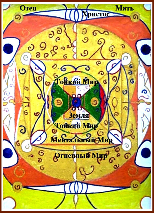 Мир Огненный подразделяется на семь слоёв. Первые высшие три – это мир Огня, Света и Огненной Мысли. Это мир Владыки, родина духа. Четыре нижних слоя – Мир Ментальный или Мир Мысленный, в котором обычно живёт человек через свои мысли.