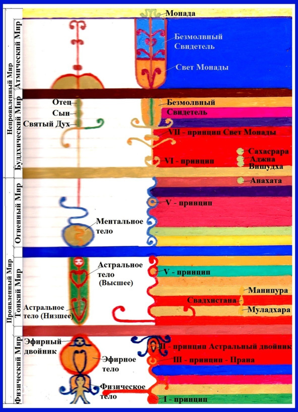 Человечество же, помимо Плотного и Тонкого Миров, своим мышлением живёт ещё и в Огненном Мире, то есть оно участвует в жизни всех трёх миров.