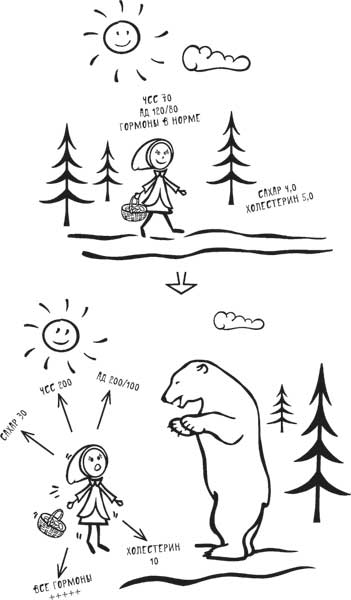 Но мы отвлеклись и оставили Красную Шапочку на тропинке с медведем. Она в жутком стрессе, парализована страхом, все показатели зашкаливают (рис. 1). Медведь же стоит спокойно, для него никакой опасности нет, он вообще не совсем понимает, что это перед ним – то ли заяц-переросток, то ли огромный, дурно пахнущий мухомор. Медведь поводил носом, посмотрел, решил не связываться, тем более он не голоден, поэтому просто сделал шаг в сторону и бесшумно скрылся в кустах.