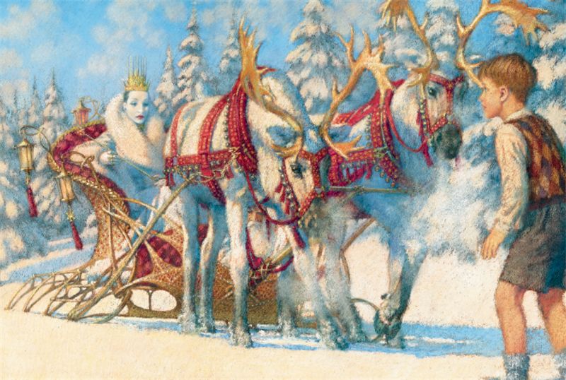 Олени были размером с шетландских пони и такого белого цвета, что по сравнению с ним даже снег не казался чисто белым. Их ветвистые рога были позолочены и горели огнём в свете восходящего солнца. Их сбруя из красной кожи была украшена колокольчиками. Оленями правил сидевший в санях толстый гном ростом около трёх футов. Одет он был в шубу из меха белого медведя, а на голове носил красный колпак, с которого свисала длинная золотая кисточка. Огромная борода доходила гному до колен и служила вместо пледа. За ним, дальше в санях на приподнятом сиденье, возвышалась совсем другая персона – огромная дама, ростом выше всех женщин, которых Эдмунду доводилось видеть в жизни. До самого горла она была укрыта белой меховой мантией, в руках дама держала длинную золотую волшебную палочку, а голову её венчала золотая корона. Лицо её было белым, не бледным, а именно белым, как снег, бумага или сахарная пудра. На белом лице алели губы. Лицо дамы могло бы показаться прекрасным, если бы не было таким гордым, холодным и суровым.
