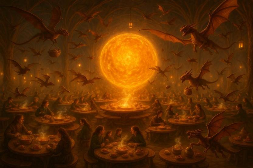 От него исходило нежное, согревающее тепло. Вокруг шара по кругу двигались длинные дубовые столы, буквально вырастая из пола и плавно меняя высоту подлетающих к ним студентов. Над столами порхали десятки дракош, неся на спинах или в маленьких корзинках, зажатых в лапках, тарелки с едой: румяные пироги, дымящиеся щи в глиняных горшочках, кисели всех цветов радуги, фрукты, источавшие мягкое сияние.