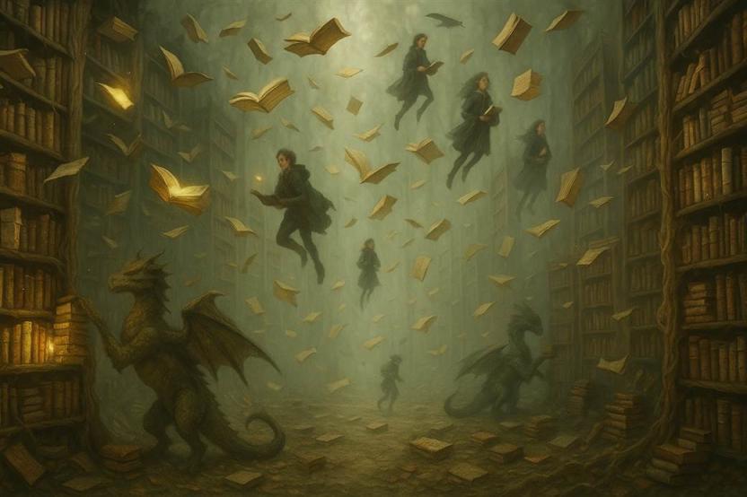 Бесконечные стеллажи из светлого дерева уходили вверх и вглубь, теряясь в дымке. Но книги не стояли на полках. Они парили в воздухе, медленно вращаясь или перелетая с места на место, словно стаи диковинных птиц. Одни светились мягким светом, другие были обернуты в старую кожу или бересту, третьи шелестели страницами сами по себе. По воздуху скользили студенты, ловко подхватывая нужные фолианты или следуя за книгами, которые вели их куда-то. Повсюду витали дракоши-библиотекари, похожие на Паву, но разных оттенков, аккуратно расставляющие «пернатых» по местам или переносящие стопки.