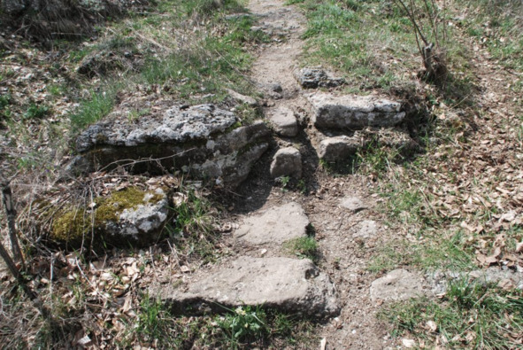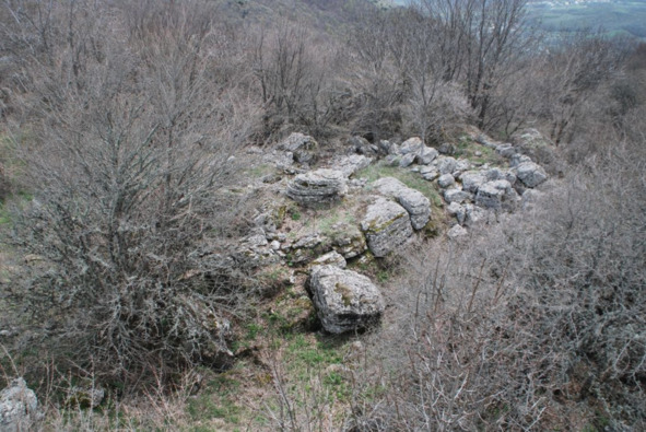 Пересекающая тропу стена сооружения, примыкающая к другой стене мегалита
