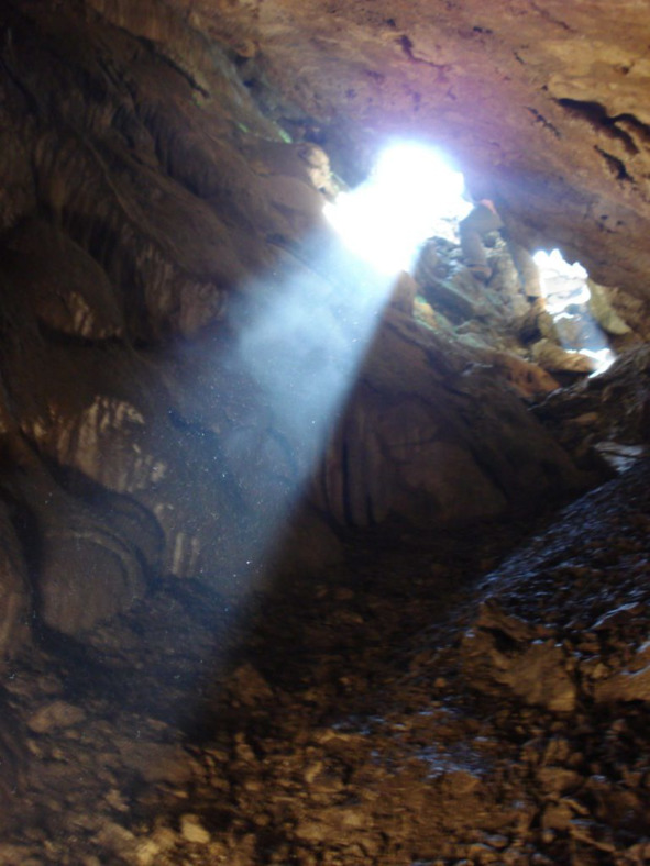 В метрах десяти от начала спуска будет уходить в гору расщелина в которую и следует спуститься и… мы окажемся в нужной нам пещере.