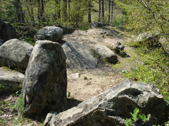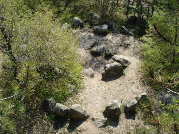 Пространство вокруг памятника усеяно камнями, из которых два большие образуют вход с западной стороны.