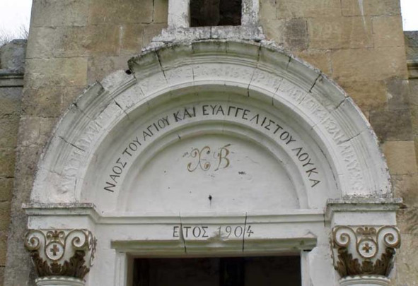 Выше этой надписи на полукруге – другая: «N-A-O-SIGMA T-O-Y A-Г-I-O-Y К-A-I E-Y-A-Г-Г-E-Л-I-SIGMA-T-O-Y Л-O-Y-K-A» (Храм Святого и Евангелиста Луки).