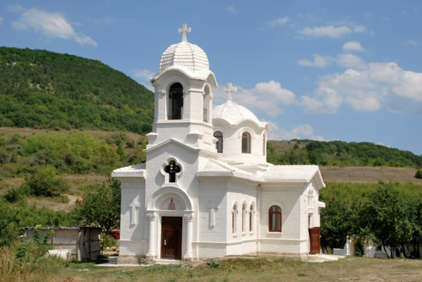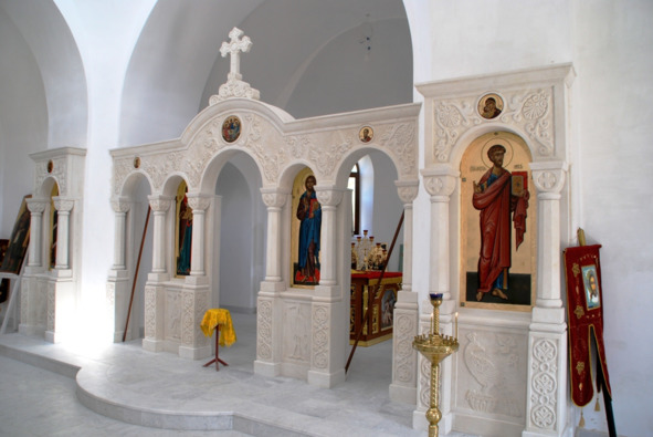 На обратном пути спускаемся в Свято-Богоявленский пещерный монастырь. Он стоит того, тем более что совсем недавно пещерный храм был обновлен. Реконструкция, проведенная в нем, дает возможность видеть древние фрески в алтаре храма. Убран иконостас и сохранена византийская каменная оградка.