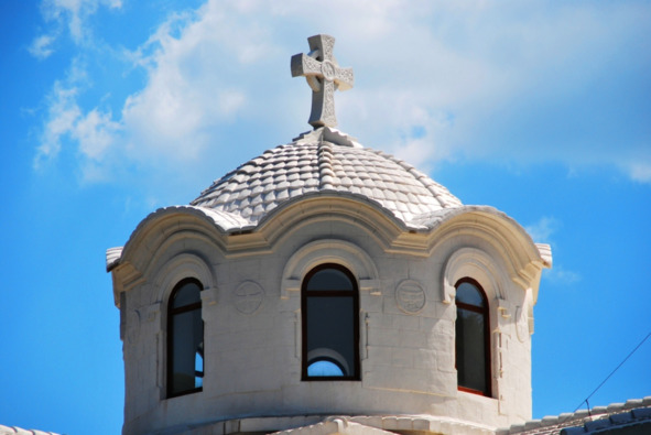 Подходим к храму со стороны колокольни. Над входом надпись по-гречески: «E-T-O-SIGMA 1904» (ГОД 1904).