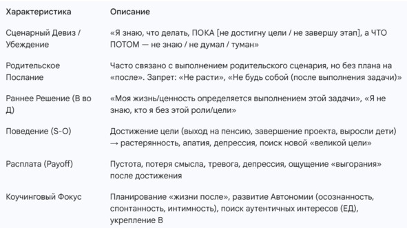 Расплата (Payoff): Главная расплата – это мучительное ощущение экзистенциального вакуума, потеря смысла жизни, подтверждение убеждения «жизнь кончена после [рубеж]» или «я больше не нужен / не важен». В тяжелых случаях это может вести к физическому или психическому угасанию, тяжелой депрессии, реализации скрытого Запрета «Не будь!».