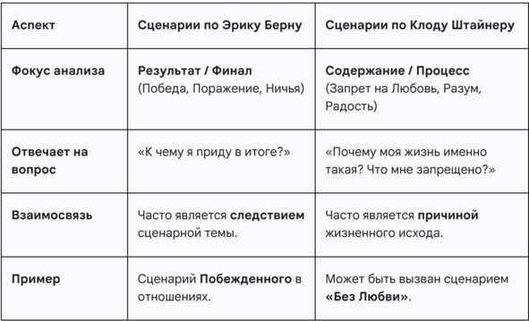 Сравнительная таблица видов сценариев Берна и Штайнера