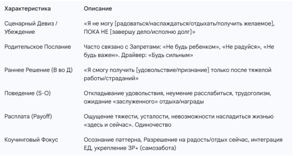 Блок Предупреждения для Коучей: Если паттерн «Пока не» связан с очень жесткими убеждениями о своей никчемности, с глубоким Запретом «Не будь!» (например, «Я не имею права жить, пока не искуплю…») или сопровождается признаками депрессии (апатия, ангедония), необходимо настоятельно рекомендовать клиенту психотерапию. Коучинг может быть лишь поддерживающим инструментом в этом случае.