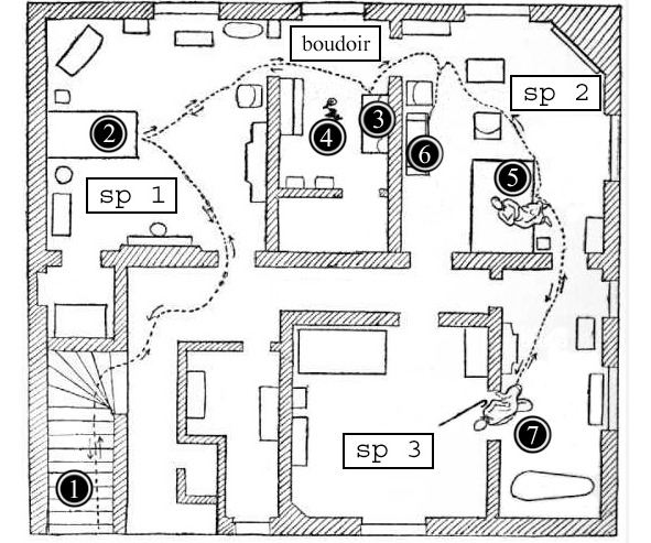 План первого этажа «дома смерти» в тупике Ронсин с указанием мест и предметов, важных для понимания случившегося в ночь на 31 мая 1908 года. Условные обозначения: «sp 1» – спальня Марты Штайнхаль, в которой Маргарита осталась в ночь нападения; «sp 2» – спальня Маргариты Штайнхаль, в которой ночевала её мать Эмили Джапи; «sp 3» – спальня Адольфа Штайнхаля, «boudoir» – будуар между спальнями. Цифрами отмечены: 1 – лестница из веранды в коридор первого этажа, по которой поднялись преступники; 2 – кровать в спальне Марты Штайнхаль, в которой спала Маргарита; 3 – бюро в будуаре, обысканное преступниками; 4 – мелкие вещи, выброшенные из бюро и лежавшие на полу, среди них большой рулон ваты, своим цветом и плотностью похожей на ту, что была использована в качестве кляпов; 5 – кровать Маргариты Штайнхаль, в которой находилось тело Эмили Джапи; 6 – стеллаж с постельными принадлежностями, осмотренный преступниками; 7 – труп Адольфа Штайнхаля в дверном проёме между его спальней и ванной комнатой.