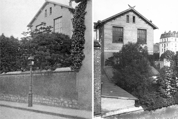 Вид дома №6 в тупике Ронсин. На обоих фотоснимках можно видеть одну и ту же часть здания и придомовой территории – ту, что выходит в тупик. Фотография слева сделана с уровня земли, точнее, улицы, справа – с крыши дома напротив. На этом снимке хорошо виден небольшой садик и крыша примыкавшей к дому веранды. В левой нижней части этой фотографии можно видеть крышу каретного сарая. Большие окна второго этажа, хорошо заметные на обеих фотографиях, служили для освещения большой мастерской. Два узких окна над ними относятся к комнате камердинера Куйяра – именно в ней слуга провёл ночь с 30 на 31 мая.