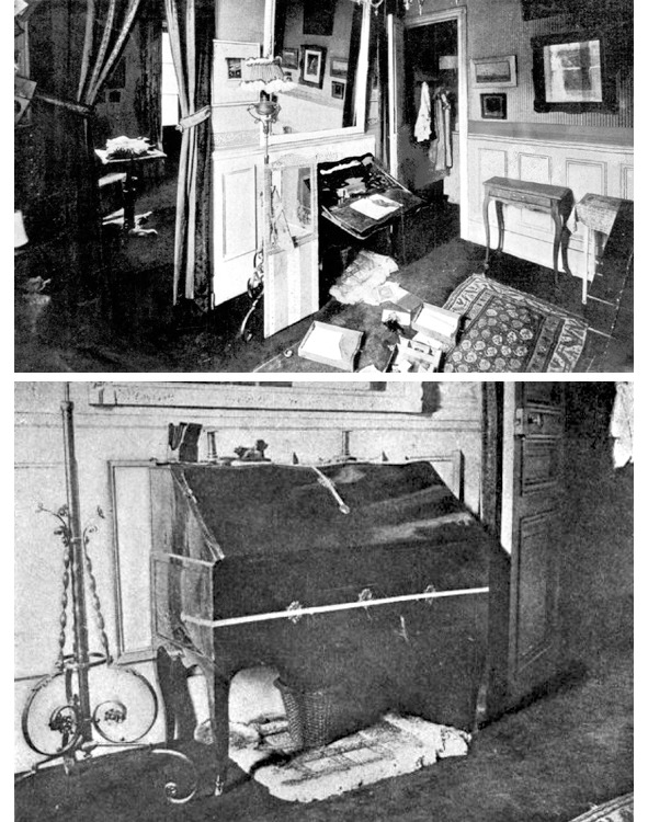 Фотографии будуара между спальнями Марты и Маргариты Штайнхаль. На снимке вверху можно видеть предметы, извлечённые преступниками по время обыска бюро и брошенные на пол. Внизу – запертое и опечатанное бюро, подготовленное к вывозу в здание полицейского управления.