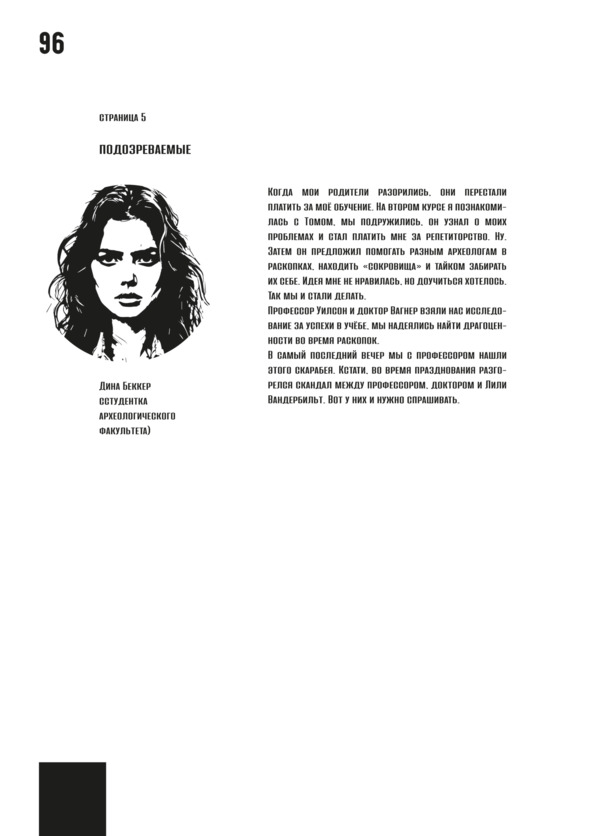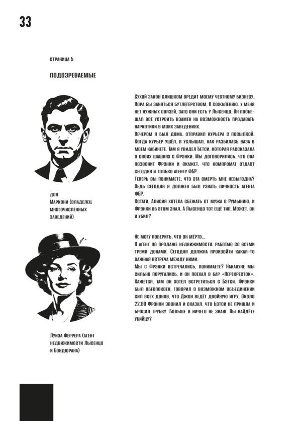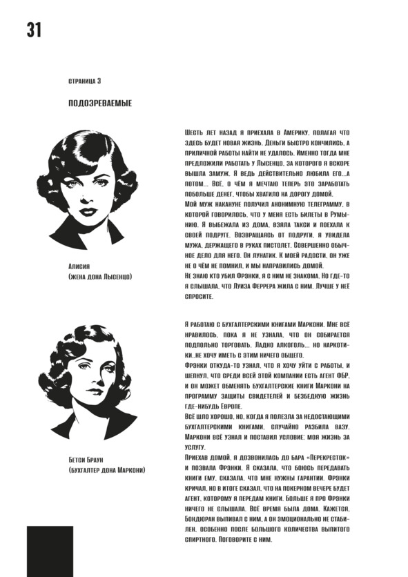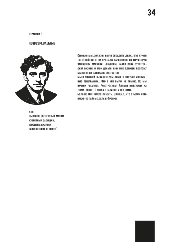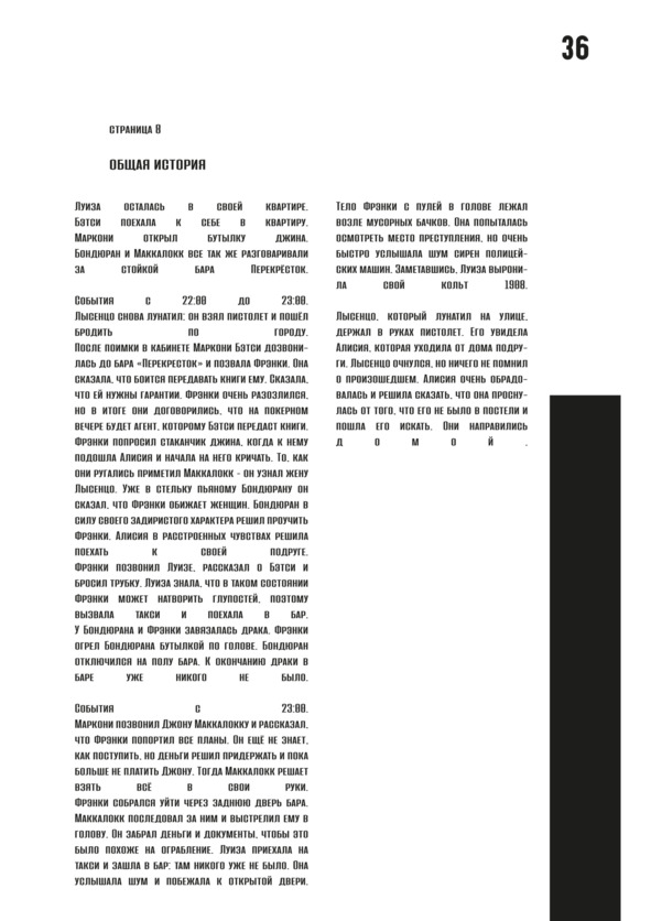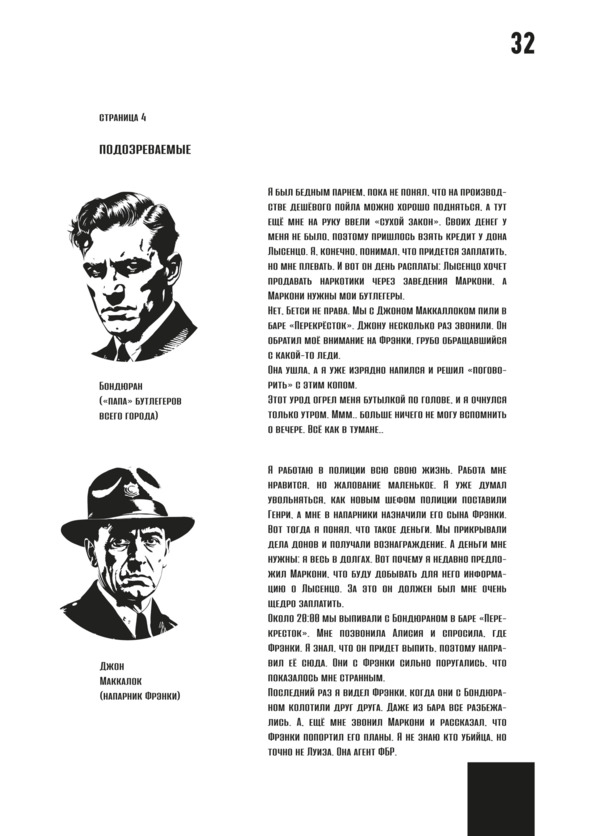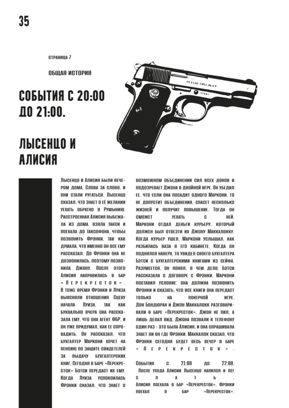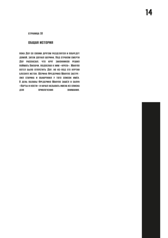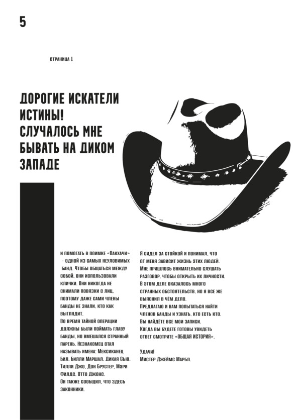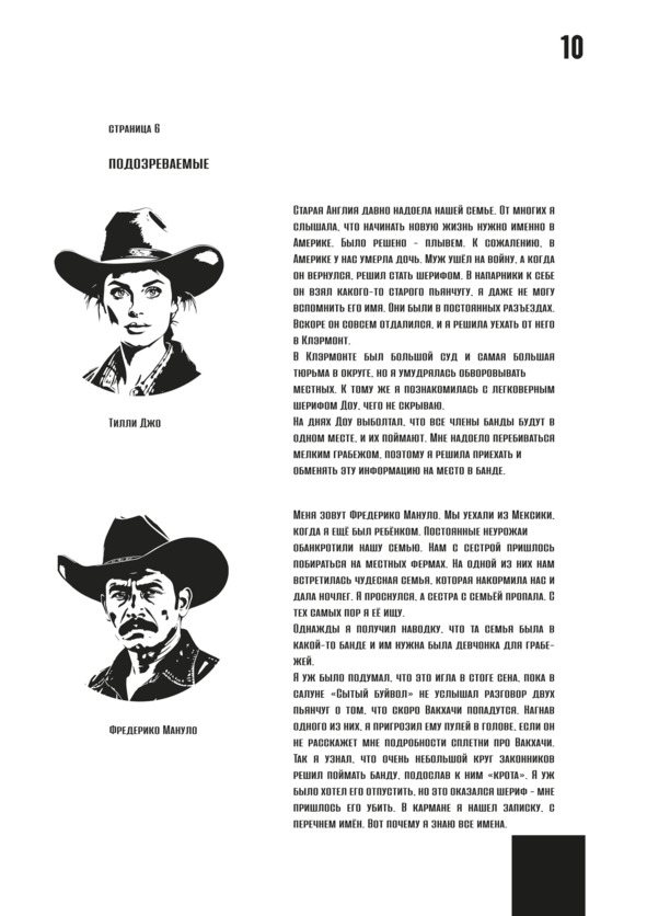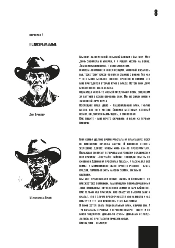 Я уж было подумал, что это игла в стоге сена, пока в салуне «Сытый буйвол» не услышал разговор двух пьянчуг о том, что скоро Вакхачи скоро попадутся. Нагнав одного из них, я пригрозил ему пулей в голове, если он не расскажет мне подробности сплетни про Вакхачи. Так я узнал, что очень небольшой круг законников решил поймать Вакхачи, подослав к ним «крота». Я уж было хотел его отпустить, но это оказался шериф – мне пришлось его убить. В кармане я нашел записку, с перечнем имён. Вот почему я знаю все имена.