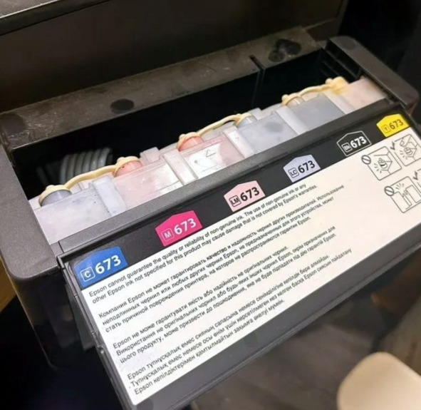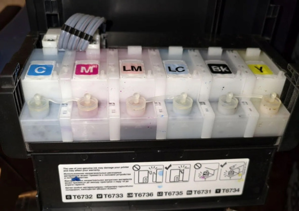 Примечание: для того, чтобы сохранить гарантию на принтер, Вам необходимо залить оригинальные чернила Epson и только после того, как они закончатся, переходить на совместимые чернила. Если Вы зальёте их при запуске нового принтера, в сервисном центре могут провести экспертизу состава чернил и на этом основании отказать Вам в гарантийном ремонте. Стоимость замены печатающей головки своими силами может оказаться сопоставима со стоимостью нового принтера.