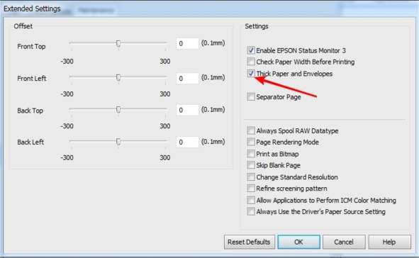 На закладке дополнительных настроек можно вручную изменить настройки, используемые по умолчанию, с автоматической цветокоррекцией, повернуть отпечаток на 180 градусов, отобразить его зеркально (это используется при сублимационной печати). Также включить или выключить высокую скорость. Эту настройку было бы точнее назвать «двунаправленной печатью», когда головка выбрасывает чернила на бумажный носитель и при прямом, и при обратном движении. Мне попадались рекомендации выключать режим «High Speed» на принтерах с большим пробегом и высоким механическим износом, когда дефекты печати не удаётся устранить в результате применения штатных процедур обслуживания. В полностью исправном принтере рекомендуется использовать низкую скорость печати в случае работы с бумагами, плохо впитывающими чернила, при печати макетов с высоким уровнем заливки. Для этой же цели в настройках печати можно найти раздел «Extended Settings» и поставить флажок «Thick Paper and Envelopes» (Рис. 24).