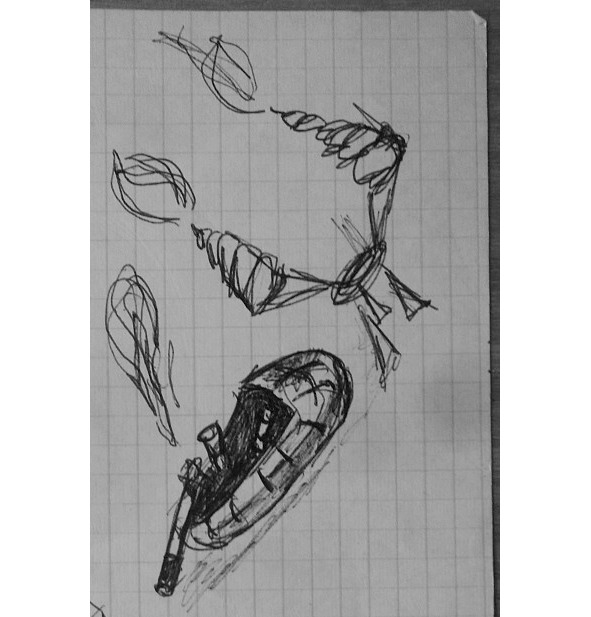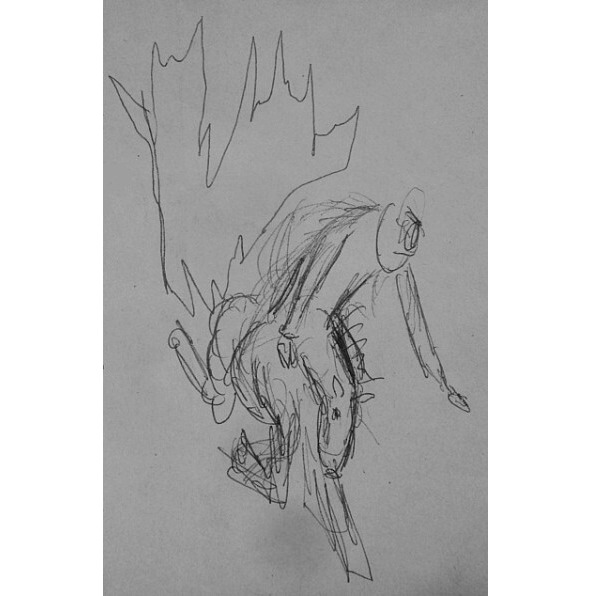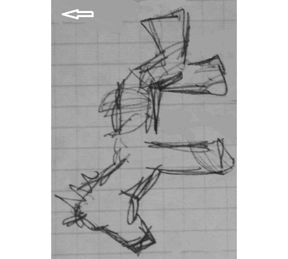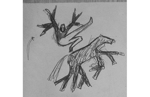 На этом рисунке мы видим, то ли какую-то брешь в пространстве, из которой вылетает, едва не падая вперёд, какой-то наездник, верхом, то ли на каком-то строптивом коне, то ли на каком-то потустороннем существе. То ли это снарядным взрывом выбиваемый из седла всадник… (1978.02.00-01-02)