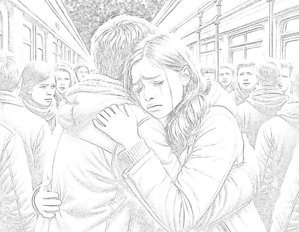 Подойдя к запотевшему окну в вагоне, парень увидел, что Настя смотрит на окна, в надежде его увидеть. Когда увидела, подбежала и прислонилась своим носиком. Алекс нарисовал сердечко и написал ЯТЛ. Девушка закивала головой, показывая, что все поняла и тоже любит. Поезд тронулся, Настенька еще несколько секунд шла рядом с вагоном, потом побежала, но вскоре отстала и остановилась.