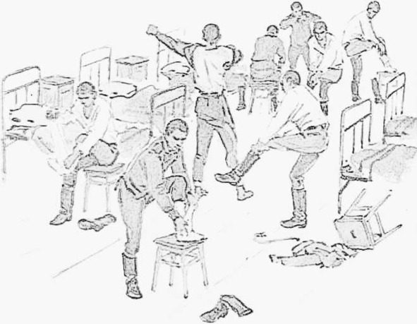 В течение получаса Алекс подробно и доходчиво показал и объяснил алгоритм действий, каждый потренировался индивидуально, потом в составе отделений. Потом все легли в кровати, предварительно разделись, некоторые пытались схитрить и легли с намотанными портянками и в штанах.