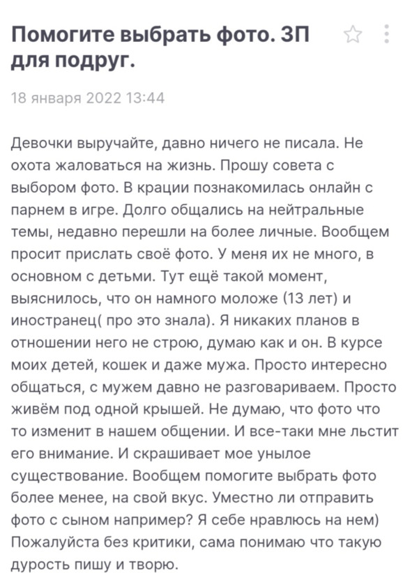 Я была очень взволнована и растеряна одновременно. С одной стороны, мне нравилось с ним общаться, а с другой – я была замужем. Это вызвало у меня противоречивые чувства. Ещё я переживала, что не понравлюсь ему на фото. Всё-таки ему было всего 30 лет, а мне уже 43. Я написала пост на женском форуме и попросила подруг помочь мне выбрать лучшее фото из того, что у меня было.