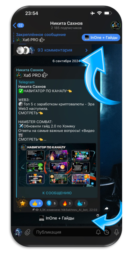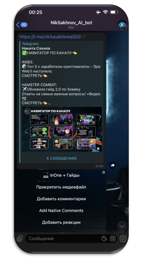 На этом скриншоте мы видим пример того, какой можно создать пост для канала с кнопкой, после чего закрепить его, и в вашем канале будет кнопка на указанный вами ресурс. Здесь, например, ссылка на мой «Хаб» – это приложение, в которое может зайти участник канала и посмотреть видео, гайды и многое другое, что размещено в моём хабе. Позже, если вы хотите использовать InOne и собрать свой Хаб для канала, этот этап будет описан далее в книге.